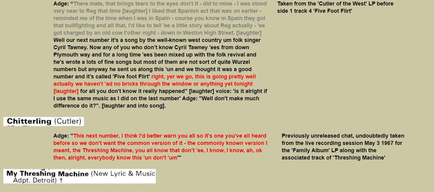 This album contained six tracks that had previously only been issued on 45rpm singles, as well as one previously unreleased track 'I'd Love To Swim In The Zuider Zee'. The remainder of the compilation, including the chat between tracks, was taken from various albums. The tracks were edited together to give the impression of a continuous live performance with snatches of Adge's chat in between. The transcript below indicates the original location of both the musical tracks and the between-track chat. The chat on this 'Don't tell I' album is in RED TYPEFACE, the text in black (not actually heard in this album) shows how it sat within the original albums. Text shown in GREY TYPEFACE, which is heard on this cassette, has been moved around when compared to the vinyl version of this album.