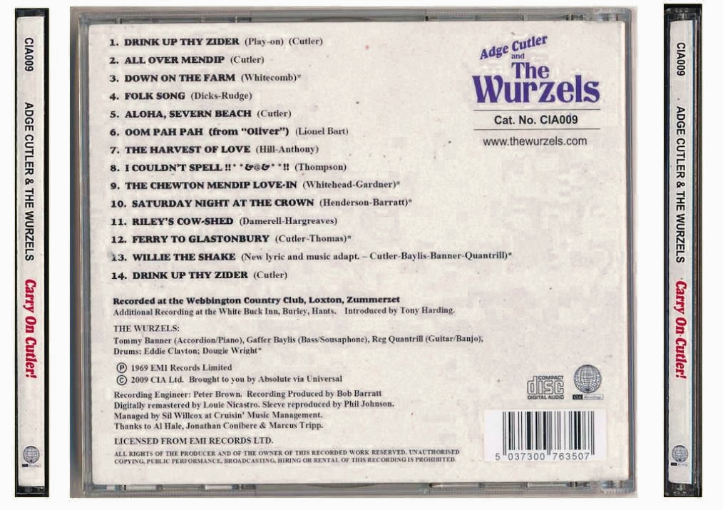 As can be read in the press release below, November 27th 2009 saw the release on CD for the first time of five out-of-print Wurzel albums - namely Adge Cutler & The Wurzels, Adge Cutler's Family Album, Carry On Cutler, Don't Tell I, Tell 'Ee and The Wurzels Are Scrumptious. The first four were all 'Adge Cutler & The Wurzels' albums (Adge's other original album Cutler Of The West having been released on CD by EMI in 2003), the final one being recorded by the Wurzels in their own right after Adge's death. For all the CDs the artwork was taken directly from the original LPs (but without the EMI/Columbia logos) and the case insert included a reproduction of the original sleeve notes - with the exception of 'Don't Tell I, Tell 'Ee' which had no sleeve notes on the original LP so a black and white copy of the artwork on the sleeve was added instead.
