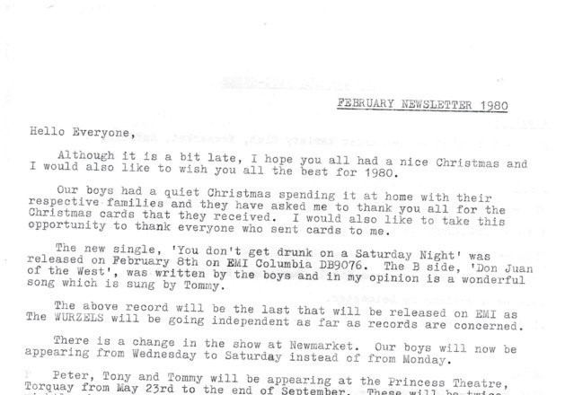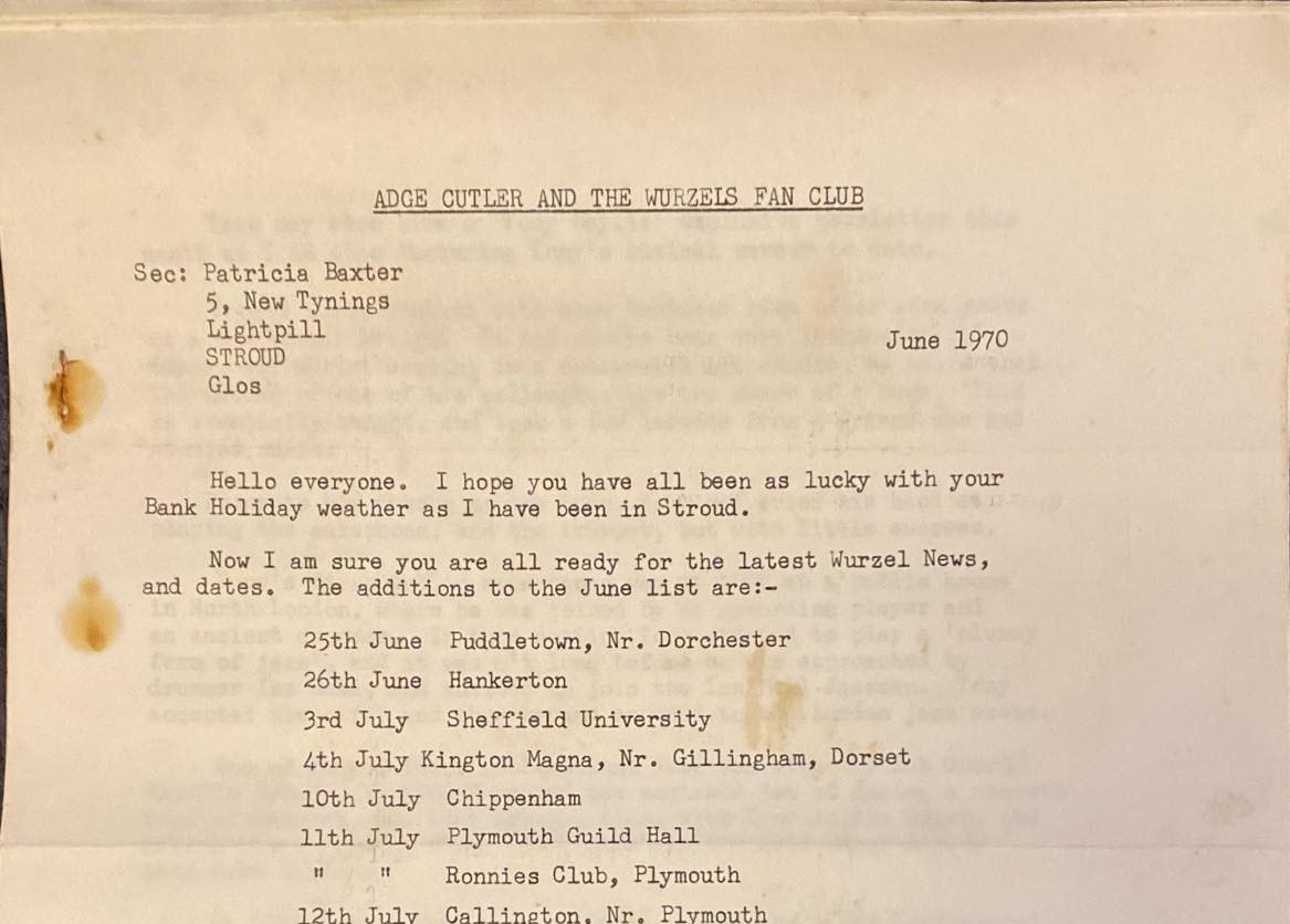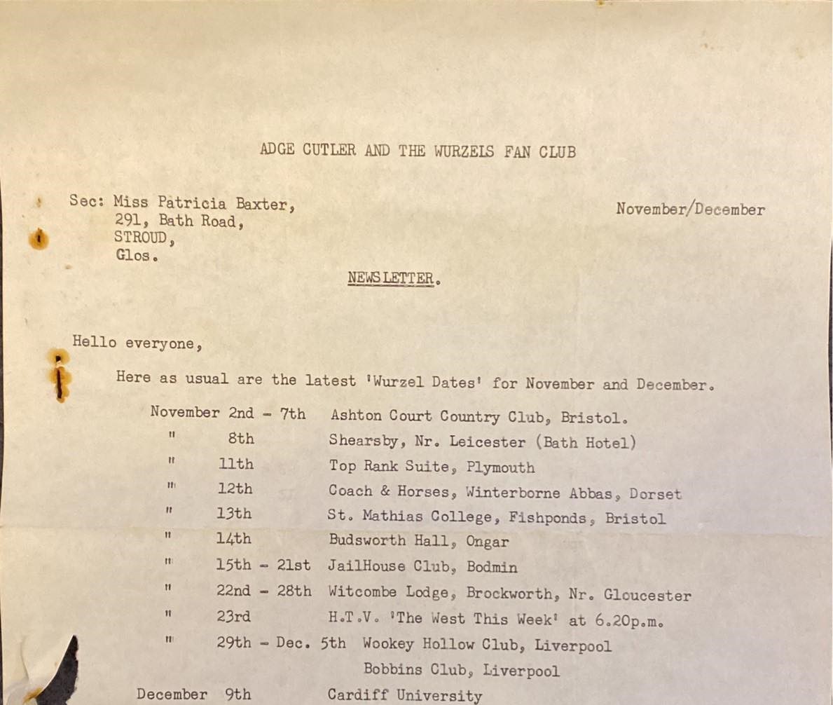 Most 'pop' groups from the 1960s onwards had 'fan clubs' of some description - some small, some large, some 'official' and others set up unofficially by keen admirers of their favourite band. Adge Cutler & The Wurzels, and later The Wurzels, were no exception. Details of these clubs are scarce and our knowledge mainly relies on members having kept a tight hold of their precious newsletters.Just select the image of a letter below to read it in full